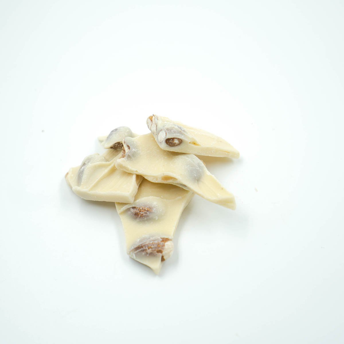 Une plaque de chocolat blanc crémeux incrustée d’amandes entières.