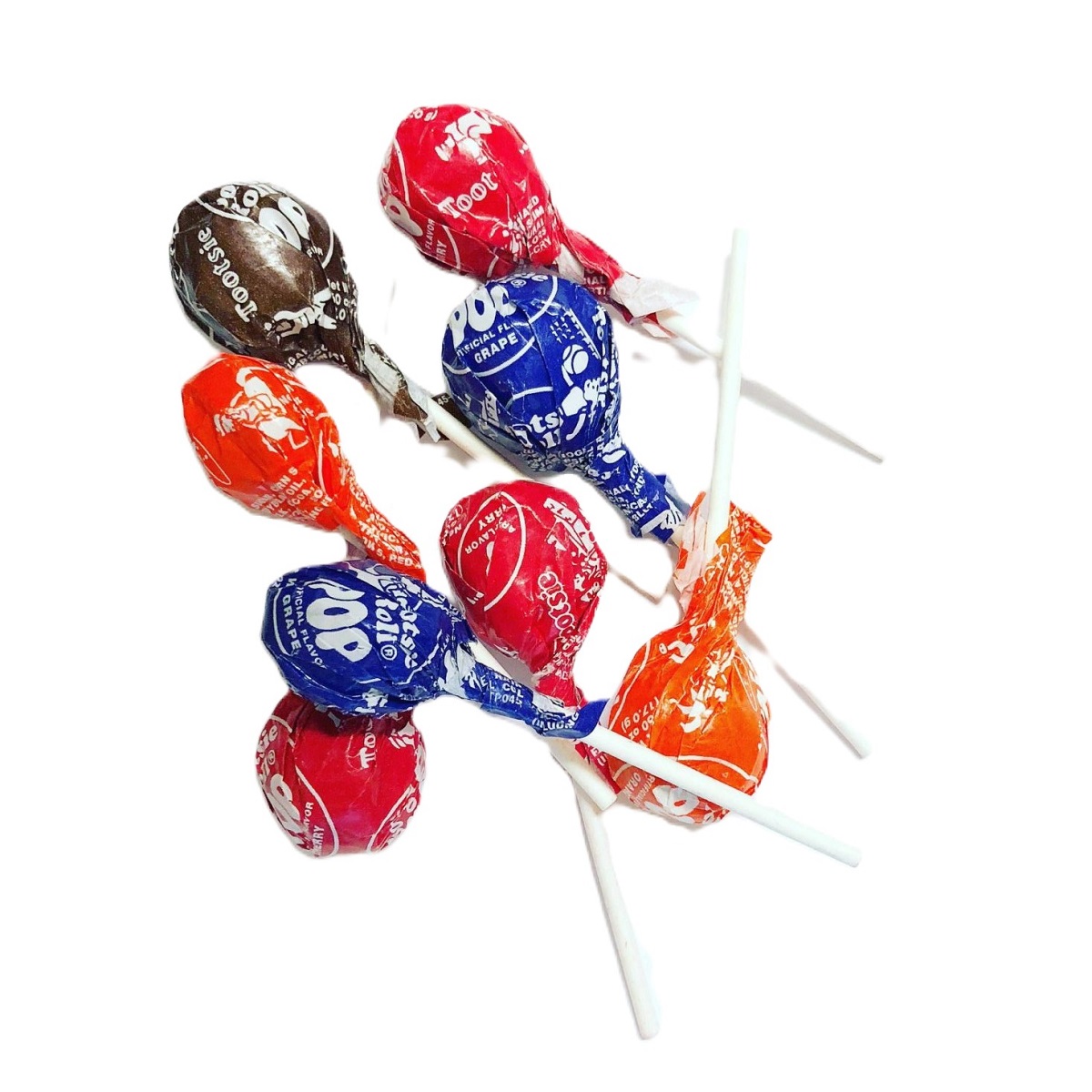 Assorted fruit lollipops with a Tootsie Roll center, a chewy chocolate taffy.