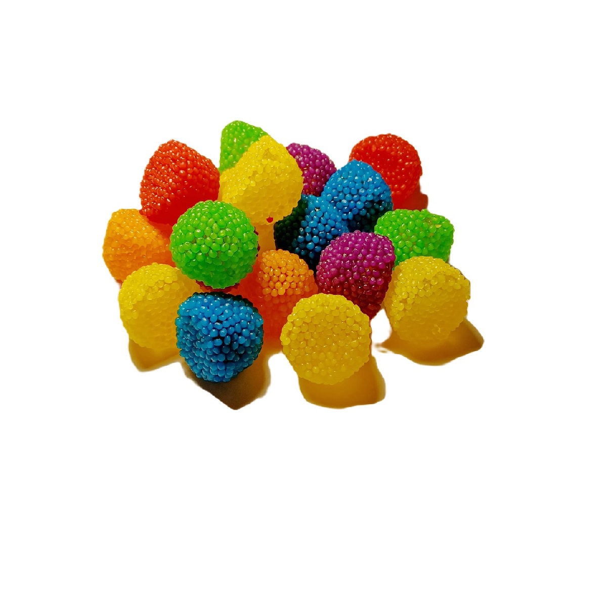 Gummy candy coated with crunchy sugar pearls, fruits flavoured : green apple, grape, pineapple, blue raspberry and peach