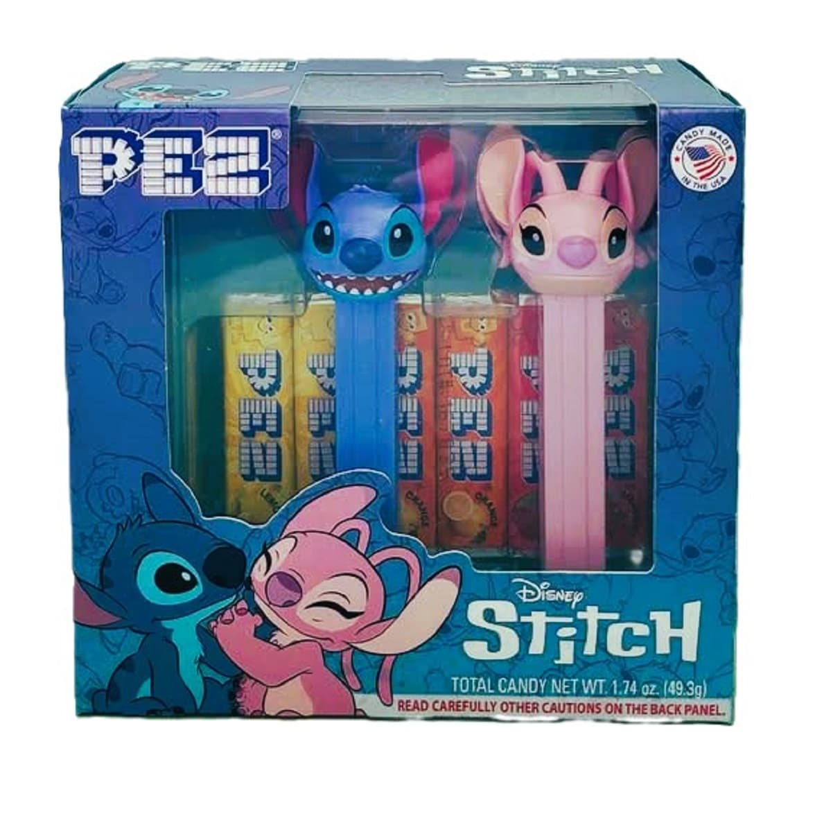 Coffret Pez contenant deux distributrices de bonbons à l’effigie de Stitch et Angel ainsi que 6 rouleaux de bonbons Pez assortis.