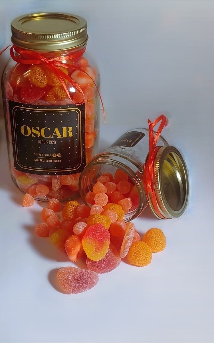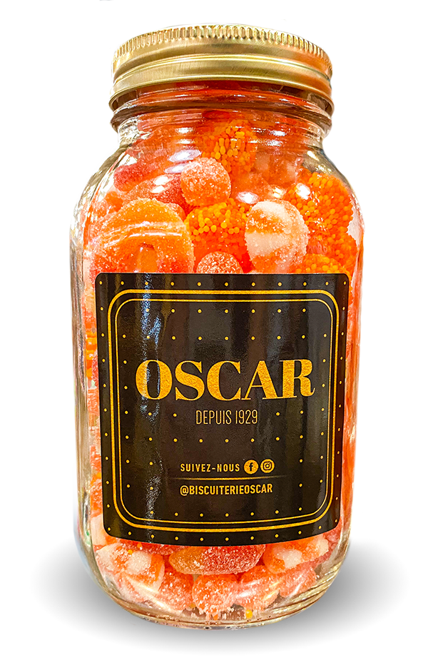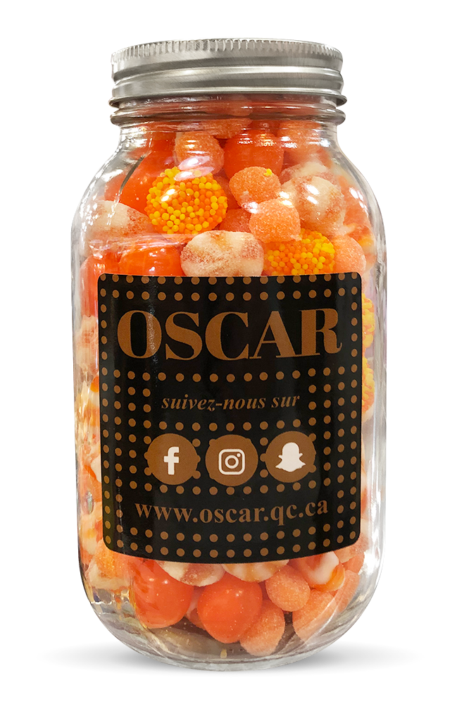 Pot Mason rempli de bonbons sucrés et/ou acidulés de couleur orange.