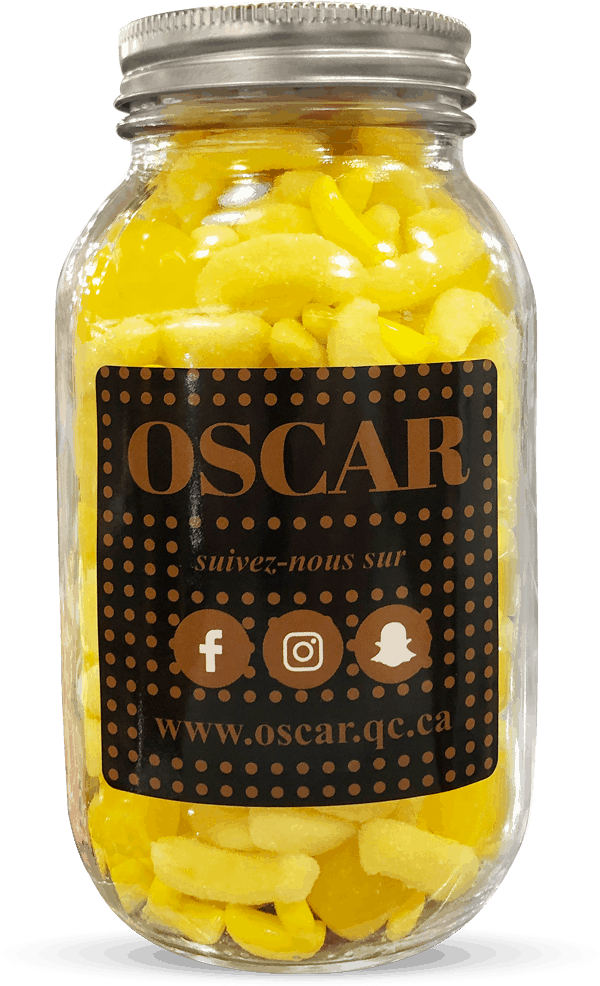 Pot Mason rempli de bonbons sucrés et/ou acidulés de couleur jaune.