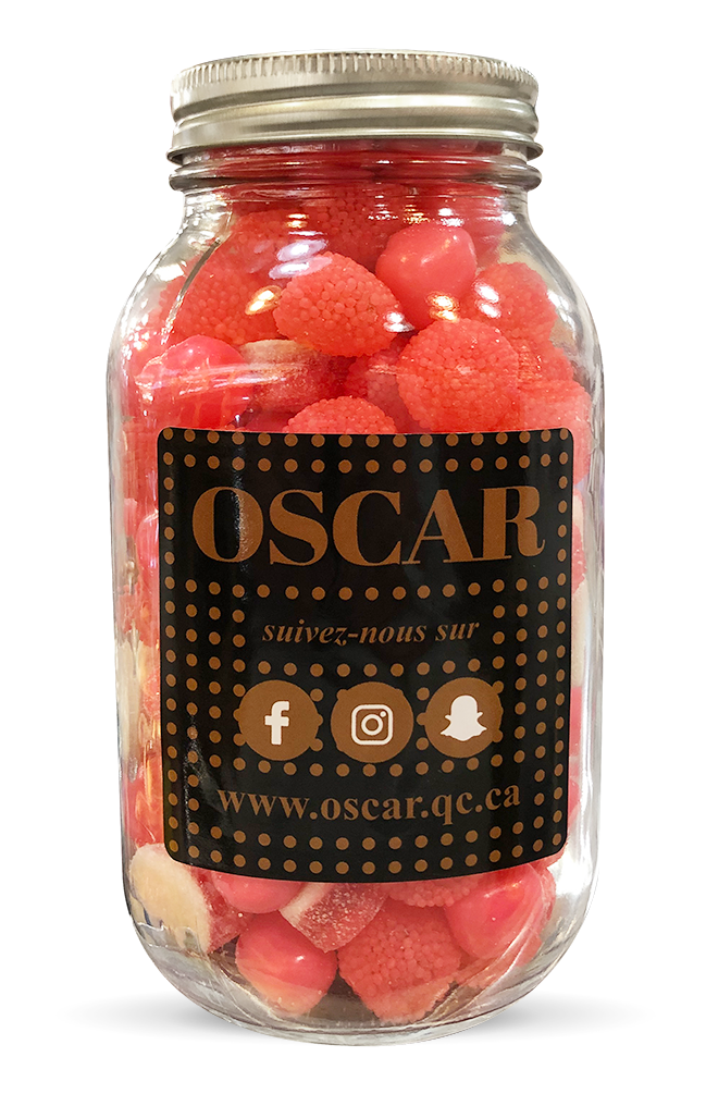 Pot Mason rempli de bonbons sucrés et/ou acidulés de couleur rose.