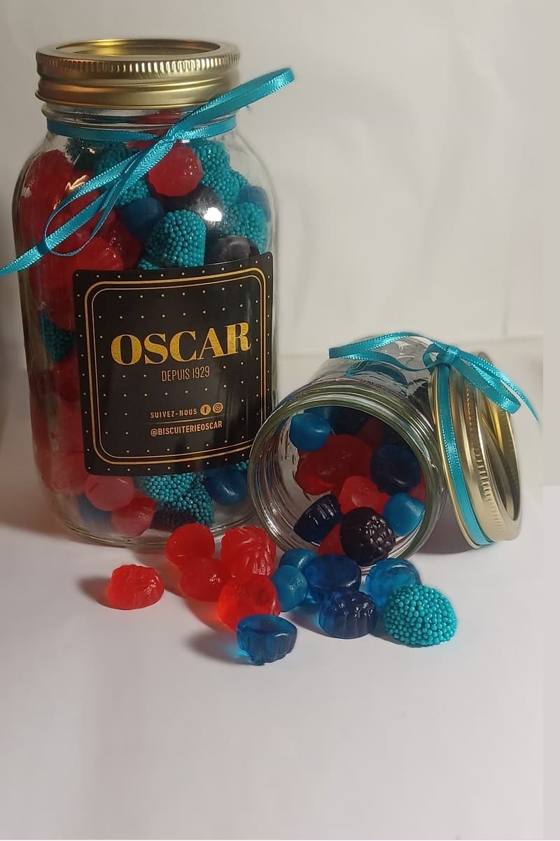 Pot Mason rempli de bonbons sucrés et/ou acidulés de couleur verte.