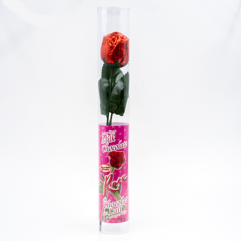 Une jolie rose en chocolat au lait avec une longue tige et des feuilles artificielles.